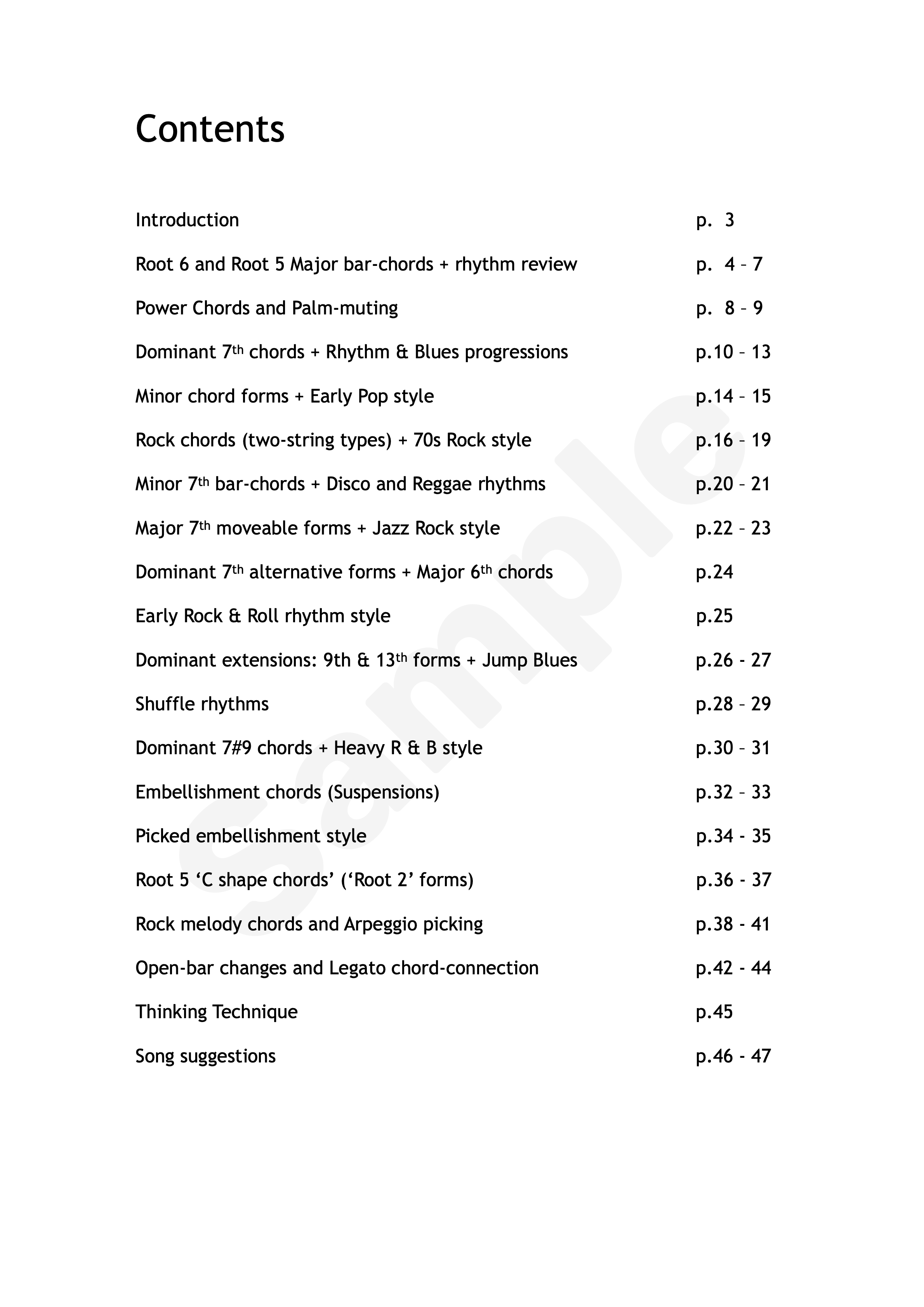 A clear step-by-step method introduces chords in a logical order of physical comfort and the progression exercises are written around changes linked by a common finger. Even a complete beginner is starting to play familiar sounding chord progressions within the first ten pages. From there on the progressions become gradually more detailed as one new chord is added at a time.